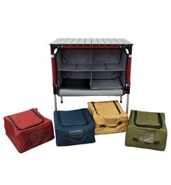 Camp Chef Sherpa Table?CLICK HERE FOR VIDEO Keep your camp super organized with Camp Chef's Sherpa Table! A rollout aluminum tabletop attaches to the top of the frame, stows away in a side pouch when not in use and telescoping legs extend for easy set up. Four padded, removable bags keep your gear in order and stow away inside. One is lined and can be used as a cooler, to keep your food warm or even as a sink. The storage bags remove and the divider unzips so that you can customize your storage options. Unzip the bottom divider and you can store a stove inside( any Camp Chef Mountain Series stove or Ranger will fit) It's safe to say that the Sherpa Camp Table has everything, including the kitchen sink.Includes Versatile aluminum roll-top table4 zippered organizer compartments (blue is lined for use as cooler or sink)Side pouch for transportation of table topPadded carry handles for easy handlingTelescoping aluminum legsUnzip the lower divider to store your stove Material: 600 denier fabricSize: 15 3/4" x 27" x 18 1/4" (with legs collapsed) Table height with legs extended - 28"Table top dimensions: 27" x 17" Individual organizer bag dimensions: 12" x 11" x 6 1/2"